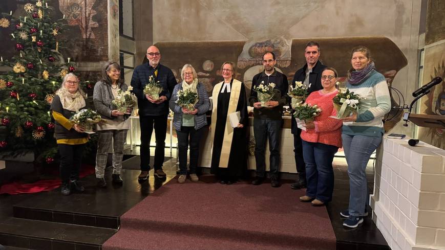 v.l.n.r.: Beatrix Kornelius, Petra Peter, Jochen Jakobi, Solfrid Rück, Pfarrerin Luise Helm, Christian Leikauf, Frank Beisel, Simone Dammert, Stefanie Grub